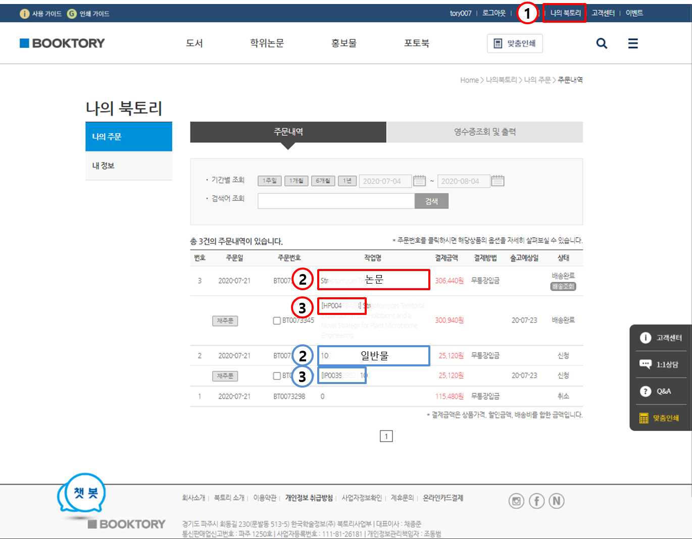 재주문의 경우 주문 시 사용하신 아이디로 로그인 후 나의북토리 -> 주문내역에서 해당 주문건을 찾으신 뒤 작업명을 클릭, 하단의 제작번호 (예 : 일반물의 경우 IP00XXXXXX / 논문 HP00XXXXXX)앞의 재주문을 클릭 후 주문을 진행해주시기 바랍니다.